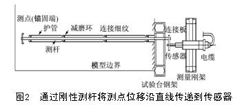 但是我們知道,地下洞室開挖后產(chǎn)生的位移主要分布在洞周圍巖內(nèi),因此多點(diǎn)位移計(jì)的測(cè)點(diǎn)需要布置在離開挖邊界較近的位置;而為了消除模型邊界條件的影響,模型的外邊界需要遠(yuǎn)離洞室才行。這樣一來,多點(diǎn)位移計(jì)的測(cè)頭就會(huì)距離測(cè)點(diǎn)很遠(yuǎn),需要通過測(cè)桿將內(nèi)部測(cè)點(diǎn)的位移傳遞到測(cè)頭的位移傳感器中。目前采用的位移傳遞方式是直線傳遞,即沿被測(cè)位移的方向從測(cè)點(diǎn)到測(cè)頭傳感器之間的連線傳遞,如圖2所示[5] 。