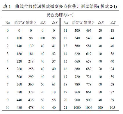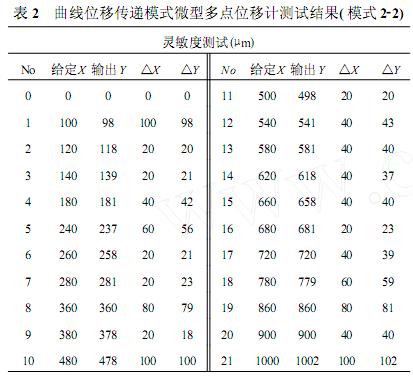 標(biāo)準(zhǔn)位移以0~9mm等間隔的10個(gè)值給定,分別對(duì)測(cè)桿進(jìn)行推、拉兩個(gè)方向的測(cè)試,每推拉一次得出一組數(shù)據(jù),取三組的平均值作為一個(gè)給定值的對(duì)比分析數(shù)據(jù)。測(cè)試結(jié)果表明,位移傳遞模式2-1的儀器重復(fù)誤差為0.09%、遲滯誤差為0.11%、非線形誤差為0.08%;位移傳遞模式2-2的儀器重復(fù)誤差為0.09%遲滯誤差為0.08%、非線形誤差為0.07%;除傳遞模式2-1遲滯誤差外,均小于0.10%。 傳遞模式2-1在推拉交替變形時(shí),由于傳遞鋼絲與護(hù)管之間的摩擦力較大,產(chǎn)生較大的遲滯誤差,因?yàn)樵囼?yàn)中采用的是普通黃油作為潤(rùn)滑劑,如果采用硅脂作為潤(rùn)滑劑并適當(dāng)增大彈簧張力的話,這種遲滯誤差會(huì)有所減少。 另外可以將第二種曲線傳遞模式的多點(diǎn)位移計(jì)布置在只產(chǎn)生單向變形的部位,如洞室群最外邊緣處的位移測(cè)量;而洞室之間的巖柱部位則布置為第一種曲線傳遞模式或直線傳遞模式的多點(diǎn)位移計(jì)。這樣可以發(fā)揮各自的優(yōu)越性,而又減少對(duì)模型制作的干擾。兩種位移傳遞模式的靈敏度測(cè)試結(jié)果分別見表1和表2。可以看出模式2-2靈敏度比模式2-1略高。