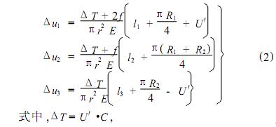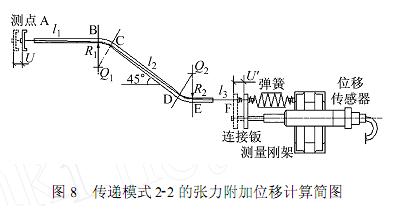 3 張力附加變形誤差分析 采用柔性鋼絲進(jìn)行位移傳遞時(shí),為了保證測(cè)點(diǎn)在產(chǎn)生正、負(fù)位移時(shí),均能引起位移傳感器的相應(yīng)位移就必須保持鋼絲中具有一定張力。此張力在位移測(cè)量過程中是一個(gè)變化值,隨測(cè)點(diǎn)到位移傳感器的距離增大而增大,反之則減小。在張力最小時(shí),要保證該最小值大于整個(gè)傳遞系統(tǒng)中的摩擦力;最大時(shí)不能超過彈簧的線性范圍。由于鋼絲中的張力的存在,而且發(fā)生變化,因而會(huì)引起傳遞系統(tǒng)附加變形,產(chǎn)生傳遞誤差以傳遞模式2-2為例,對(duì)該誤差進(jìn)行分析。假定鋼絲與護(hù)管之間只有兩個(gè)點(diǎn)接觸,每個(gè)接觸點(diǎn)的摩擦力均為f,而且該摩擦力f不隨張力改變而改變。設(shè)由彈簧張力增加所產(chǎn)生的張力附加位移為△U,傳感器測(cè)量的位移值是U′,實(shí)際位移值U可近似由下式進(jìn)行修正計(jì)算: