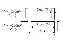 電流采樣集成電路IR2171/2172是IR公司生產(chǎn)的,引腳及應(yīng)用電路如圖5所示。它是8腳DIP封裝的集成電路,輸入信號是模擬形式的采樣電壓,輸出信號是數(shù)字形式的PWM波,另外還有過流輸出信號。圖中的采樣電阻 串在每相回路中,相電流在 兩端的電壓降被轉(zhuǎn)換成PWM輸出,輸出波形如圖6所示,周期為25us,占空比隨電流大小和方向而變。當(dāng)電流為零即 兩端的電壓為零時,引腳 輸出的PWM占空比為50%。當(dāng)電流正向流動導(dǎo)致引腳 與 之間的電壓為正時,占空比大于50%,當(dāng)兩腳之間的電壓達(dá)到260mV時,占空比達(dá)到最大值93%。當(dāng)電流反向流動導(dǎo)致引腳 與 之間的電壓為負(fù)時,占空比小于50%,當(dāng)兩腳之間的電壓達(dá)到–260mV時,占空比達(dá)到最小值7%。這種集成電路和高壓浮動MOS柵極集成電路如IR2136共同使用在小功率驅(qū)動電路中非常方便,上橋臂共用一組15V電源,輸出信號與下橋臂共地,可直接與控制部分連接,也可經(jīng)過光耦隔離再與控制部分連接[2]。
