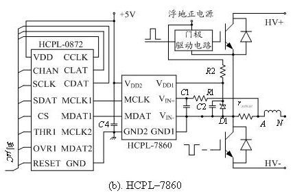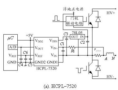 線性隔離采樣光耦HCPL–7520系列和HCPL–7860系列由Agilent公司生產(chǎn),其引腳和內(nèi)部結(jié)構(gòu)如圖7所示[3][4]。兩者的推薦輸入電壓范圍為±200mV,前者的輸出腳 為模擬電壓信號,如圖8所示。后者內(nèi)部的調(diào)制器則將輸入的模擬信號轉(zhuǎn)變成高速(10MHz)的數(shù)字信號流,每位數(shù)字信號的時間平均值正比于輸入信號,從輸出腳 輸出,引腳 輸出10MHz的時鐘。它們在電機(jī)驅(qū)動中的使用如圖9所示。由于光耦需要兩個隔離的5V電源,輸入側(cè)的5V電源可從上橋臂的浮地正電源通過78L05獲得,如圖9(a)所示,也可通過穩(wěn)壓二極管獲得,如圖9(b)中的 。圖9(a)中,光耦的輸出可直接送到微處理器的模數(shù)轉(zhuǎn)換器輸入端,或通過運(yùn)算放大器進(jìn)行適當(dāng)變換再到其輸入端。圖9(b)中,數(shù)字接口芯片HCPL–0872將光耦的每一位數(shù)字信號轉(zhuǎn)換成15位的輸出字,正最大輸入(320mV)對應(yīng)的輸出字為7FFFH,零輸入對應(yīng)的輸出字為4000H,負(fù)最大輸入(-320mV)對應(yīng)的輸出字為0,并提供串行輸出接口,適用于SPI、QSPI、Microwire等協(xié)議。一片HCPL–0872可與兩片HCPL–7860連接,通過HCPL–0872內(nèi)部的寄存器,可設(shè)置5種轉(zhuǎn)換模式、3種預(yù)觸發(fā)模式、偏移量標(biāo)定、過流檢測和電流閾值設(shè)定[5]。HCPL–7520的帶寬為100KHz,0.06%的非線型,HCPL–7860的帶寬隨轉(zhuǎn)換模式而不同,典型值為22KHz。這兩個系列的光耦檢測電流的范圍可從小于1A到100A。