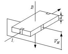 以上兩種傳感器是將被測電流轉(zhuǎn)換成電壓,再隔離放大,輸出線性電壓信號。基于霍爾效應(yīng)的電流傳感器則不同,它以被測電流產(chǎn)生的磁場為媒介,處于磁場中的霍爾發(fā)生器輸出相應(yīng)的電信號。圖10所示的是霍爾效應(yīng)原理示意圖,一片厚度為 的導(dǎo)電材料處于磁密為 的磁場中(磁場方向與導(dǎo)體表面垂直),縱向流過的控制電流為 ,則在橫向兩表面間產(chǎn)生電勢差 ,其大小為:
