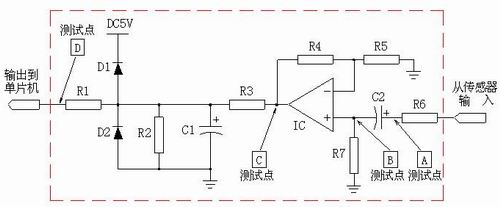 第三部分從測試點C到測試點D。該部分的作用是對已經(jīng)放大的信號進(jìn)行濾波處理,以得到比較平直的信號波形,圖5為經(jīng)過濾波處理后的信號波形,信號波形測試點為D點,可以看出,信號波形已變得比較平直。二極管D1、D2起信號鉗位的作用,以確保輸入到單片機的信號在0~5V的范圍內(nèi)。