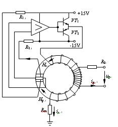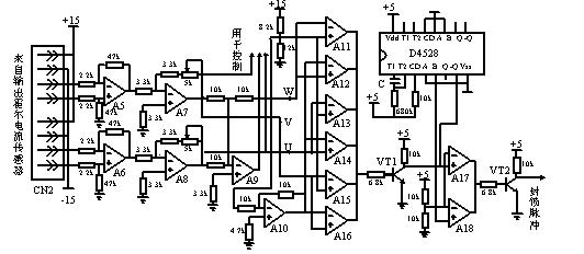 2 LEM傳感器的工作原理及特性 2.1 LEM電流傳感器 LEM電流傳感器是利用霍爾效應的閉環電流傳感器,是一種模塊化的有源電子傳感器,它把普通互感器與霍爾器件、電子電路有機地結合起來,既發揮了普通互感器測量范圍寬的優勢,又利用了電子電路反應速度快的長處,可以對直流、交流、脈動電流進行測量。圖1是LEM電流傳感器的原理圖。 圖1 LEM電流傳感器原理圖 LEM模塊的工作原理是磁場平衡式的,即通過次級線圈的電流所產生的磁場補償被測電流所產生的磁場,使霍爾器件始終處于檢測零磁通的工作狀態。其具體工作過程為:當被測回路有電流(ip)流過時,在導體周圍產生一個強磁場,這一磁場被聚磁環聚集,并作用于霍爾器件輸出一信號,這一信號經放大器放大并輸入到功率放大器中,這時相應的功率管的導通壓降改變,從而獲得一個補償電流(is),流經多匝導線產生一磁場(Hs),由于其與被測電流所產生的磁場(Hp)方向相反而使霍爾器件輸出的信號逐漸減小,最后當is所產生的磁場與ip所產生的磁場相等時,is不再增加,這時霍爾器件就達到了零磁通檢測。上述平衡過程是在極短的時間內完成的,是一個動態平衡過程,即被測電流任何變化都會破壞這一平衡磁場,而一旦磁場失去平衡,霍爾器件就會有信號輸出,經放大器放大后,立即有相應的電流流過次級線圈進行補償,因此,從宏觀上看,次級補償電流的安匝數在任何時間都與主電流的安匝數一樣。在實際應用中,可通過測量電阻Rm(通常為外接)上的電壓間接求出被測電流的大小。  圖2 LEM電壓傳感器原理圖 由以上工作原理可知LEM電流傳感器實質是一個“電流—磁—電壓”變換器,其作用與傳統的電流互感器基本相同,與普通傳感器相比較,它又具有許多自身的特性和優勢。它有良好的輸入輸出間電隔離,原級電路與次級電路之間的絕緣電壓一般為2~12kV(特殊要求下可達20~50kV),可以有效地保護副邊的測量設備和人身安全。傳感器內部采用閉環結構,可以不失真地傳遞從0Hz(直流)至100kHz頻帶內的任何波形電流,響應速度快(小于1ms)。跟蹤速度di/dt高于50A/ms,而普通互感器響應時間為10~20ms,不能滿足系統對諧波進行實時檢測并補償的要求。因為是補償式測量,所以具有很高的準確度和線性度。測量精度優于1%原級額定電流,其線性度優于0.1 %。另外,由于傳感器磁路幾乎是零磁通工作,動態變化時又是快速補償,所以傳感器是無電感性器件。它的過載能力強,當原邊電流超負荷時,模塊達到飽和,可自動保護。LEM電流傳感器著這些特性已經使其已成為電流檢測的主力。 2.2 LEM電壓傳感器 LEM電壓傳感器工作原理與其電流傳感器相似,也是一種應用霍爾原理的閉環電流傳感器。與應用LEM電流傳感器有所不同的是,用電壓傳感器測量電壓時,應在傳感器原邊回路上串聯一外部電阻(R0)。所串聯的外部電阻的大小是由用戶根據原邊電流與被測電壓成一定的比值來確定的,LEM電壓傳感器的原理如圖2所示,具體工作工程不再贅述。 LEM電壓傳感器具有精度高、線性度好、低溫漂、抗外界干擾能力強、共模抑制比高、反應速度快、頻帶寬等特點。 3 LEM傳感器在通用變頻器檢測與保護中的應用 在通用變頻器中,檢測電路把變頻器和電動機的工作狀態反饋至微處理器以控制變頻器輸出,而保護電路則是變頻器安全可靠運行的“生命線”,其主要作用是檢測信號判斷變頻器本身或系統是否出現了異常。保護電路的主要任務是完成瞬時過電流、對地短路、過電壓、欠電壓、變頻器過載、散熱片過熱、控制電路異常等多種保護。下面介紹LEM傳感器在變頻器檢測與保護中的應用。  圖3 通用變頻器用電流檢測及過流保護電路 3.1電流檢測過流保護電路 變頻器電流檢測信號可以用于電機的轉矩和電流控制以及過流保護。其檢測方法主要有直接串聯取樣電阻法,電流互感器法等,考慮到控制性能的要求,此處選用基于LEM電流傳感器的方法。變頻器驅動的負載―電動機不同于其它負載(如電熱爐、電解、電鍍等),它是將電能轉換為機械能的裝置,既有電氣行為又有機械旋轉運動,電機啟動帶來的電氣和機械沖擊問題歷來是工程師們關注的焦點,無論是電氣絕緣破損還是機械故障都可能使變頻器因過電流而損壞,過電流故障從來就是變頻器最常見的故障,也是損壞變頻器最主要的原因。輸出短路、電機繞組破損、機械負載堵轉、電機加速過快、開關器件失效、干擾造成的誤導通等都能導致變頻器過電流。 過流保護最簡單的方法是熔斷器保護法,但這種保護動作慢,不能實現快速保護,尤其是不能直接保護IGBT、MOSFET等熔通達時間小的高性能器件。因此須配置電子式保護電路,其結構組成主要包括電流檢測、過流處理和封鎖開關管脈沖等幾個部分。 圖3給出了變頻器的電流檢測及過流保護電路。其工作原理為:U、V兩相電流檢測信號來自輸出端的LEM電流傳感器,經首級運放A6和A5放大后送入二級運放A8和A7。這兩相電流通過A9疊加獲得W相電流信號,然后獲取的三相電流信息送控制器實現調速策略。每一相電流輸出到兩個比較器,比較器正反相輸入端的參考電壓分別為+10V和-10V。當三相電流正常時其對應的電壓在±10V之間,六個比較器相與后輸出為1,此信號經三極管反相后送入由多諧振蕩器D4528組成的單穩態觸發器,-Q輸出為0,比較器A17、A18輸出信號也應為0,保護電路不動作