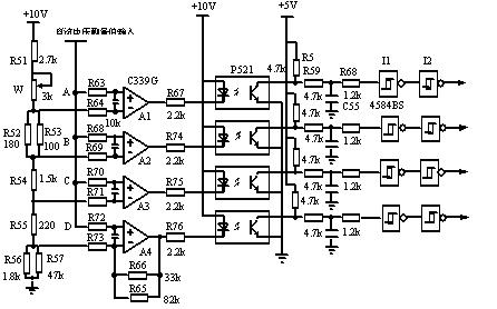 通用變頻器直流電壓檢測及保護電路如圖4所示,直流電壓經LEM電壓傳感器變為弱點信號(其接線圖見圖5),輸出信號經放大處理后分別送至四個比較器A1~A4的正相輸入端與四個參考電壓A、B、C、D比較,以完成過壓和欠壓保護并通知CPU發出相應的報警信號。 比較器參考電壓取自電阻R51~R57組成的分壓器,10V標準電壓經電阻分壓后取出四個不同的參考電壓分別送至四個比較器的反相輸入端,比較器的輸出信號經光耦隔離、阻容濾波之后再經施密特反向器關閉IGBT,同時送CPU進行處理。