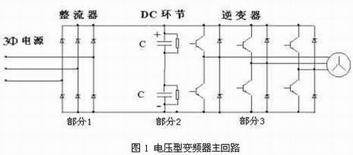 變頻器是利用電力半導(dǎo)體器件的通斷作用將工頻電源變換為另一頻率的電能控制裝置, 其最主要的特點是具有高效率的驅(qū)動性能及良好的控制特性。簡單地說變頻器是通過改變電機輸入電壓的頻率來改變電機轉(zhuǎn)速的。從電機的轉(zhuǎn)速公式 可以看出,調(diào)節(jié)電機輸入電壓的頻率f,即可改變電機的轉(zhuǎn)速n。目前幾乎所有的低壓變頻器均采用圖1所示主電路拓撲結(jié)構(gòu)。