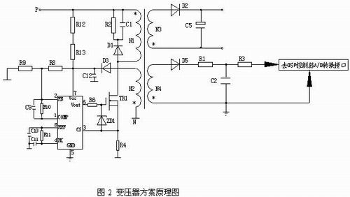 變頻器控制回路的電源電壓一般采用開關(guān)電源的方式來獲得,利用開關(guān)變壓器的特點,在副邊增加一組繞組N4(匝數(shù)根據(jù)實際電路參數(shù)決定)作為母線電壓的采樣輸出,開關(guān)變壓器的原邊電壓為母線電壓,而副邊輸出電壓隨著原邊輸入電壓的變化而線性地發(fā)生變化,這樣既能起到強弱電隔離作用又能起到降壓作用,把此采樣信號經(jīng)過處理可以送到DSP內(nèi)進行A/D采樣實現(xiàn)各種保護工作。