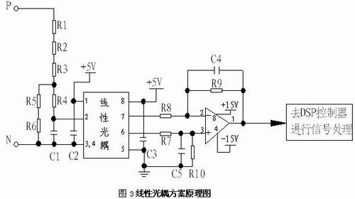 在這種方式中,光耦的初級接受一組待測的摸擬電壓信號,次級輸出一對差動的電壓信號。輸入與輸出之間在一定范圍內(nèi)是一種線性的當量關(guān)系。在設(shè)計應(yīng)用中必須分別給光耦的輸入、輸出端提供隔離的+5V電源,且運放電路必須提供±15V電源,直流母線電壓經(jīng)過電阻分壓后接入光耦的輸入端,輸出信號線性地跟隨輸入信號地變化,光耦的輸出信號經(jīng)放大電路放大后提供給DSP進行內(nèi)部處理。