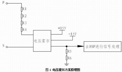 采用電壓霍爾對母線電壓進行測量,按霍爾使用要求必須提供±15V電源,且電源電壓的誤差不超過±5%,由于霍爾輸入端電流不超過10mA,可根據(jù)母線電壓的范圍及長時間工作發(fā)熱的要求配置輸入端電阻,此電壓霍爾的輸入、輸出已隔離,因此霍爾的輸出電流信號經(jīng)電阻R5、R6采樣轉(zhuǎn)換成電壓信號后再進行處理(如濾波、放大等)可直接引入DSP,進行實時采樣計算。根據(jù)母線電壓檢測范圍的不同可選取不同耐壓等級的電壓霍爾傳感器。