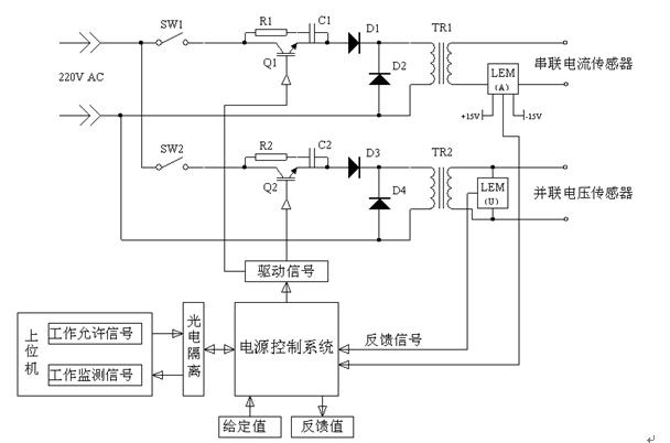 汪殿龍 齊鉑金 陳瑋山 白偉 (北京航空航天大學(xué) 機械工程與自動化學(xué)院,北京 100083) 摘 要:首先簡要介紹了電壓/電流傳感器測試電源的用途及應(yīng)用場合,針對常規(guī)電壓和電流傳感器的特點,采用高精度電壓/電流LEM模塊為基準(zhǔn)源,設(shè)計了雙通道的隔離型主電路拓撲和控制系統(tǒng),并留有上位機控制和檢測端口,最后給出了該電源的技術(shù)參數(shù)。試驗結(jié)果表明,電壓/電流LEM模塊精度高、動態(tài)特性好,該電源可以用于傳感器的標(biāo)定、多個傳感器一致性的檢測測試,具有廣闊的應(yīng)用前景。 關(guān) 鍵 詞: 傳感器;LEM模塊;測試電源 中圖分類號:TP212.6 文獻標(biāo)識碼:A 文章編號: Double Channels Sensor Measure Power Supply based on Voltage and Current LEM Module WANG Dianlong, QI Bojin, CHEN Weishan , BAI Wei (School of Mechanical Engineering and Automation, Beijing University of Aeronauticsand Astronautics,Beijing 100083,China) Abstract: Application and its using occasion of sensor measure power supplyissimply introduced firstly. Used high precise voltage and current LEM moduleas reference, the isolated main topology and its control system with double channels isdesigned based on the character of voltage and current sensor. The super -computer contro lling, detecting port and the power supply's technical parameter are given.Showed through the experiment result, the voltage and current LEM module precision and namic character is good. The power supply is used for sensor's calibration and coherence entirely with wide using prospect. Keywords: Measure power supply; sensor; LEM module 1.前言 電量傳感器是用來變換電壓或電流的裝置,也是電力系統(tǒng)中供測量和保護用的重要設(shè)備之一,按用途分為電壓傳感器和電流傳感器兩大類。電壓/電流傳感器都是將電力系統(tǒng)中的大電流/大電壓按照一定的比例變?yōu)闃?biāo)準(zhǔn)的小電流/小電壓,用來作為測量和保護的重要參數(shù),因此傳感器的精度與動態(tài)響應(yīng)時間尤為重要[1][2]。 傳感器在出廠前必須進行精度校核以獲得一定的精度才能滿足使用要求。LEM傳感器模塊以其測量精度高、動態(tài)響應(yīng)快、測量范圍寬等優(yōu)點得到了廣泛的應(yīng)用,因此選用高精度快速電壓/電流LEM模塊作為測量基準(zhǔn)源[3],研制成功了電壓/電流兩用的雙通道傳感器測試電源,作為檢測和校準(zhǔn)電壓/電流傳感器的專用設(shè)備。 2.測試電源的工作原理 為了得到大范圍的電壓和電流變化幅值,拓寬測試量程,同時考慮設(shè)備的安全性,測試電源采用主變壓器隔離型的主電路結(jié)構(gòu),因此測試電源必須具備輸出高電壓和大電流的能力。這里為了減小整個電源的體積、質(zhì)量,把電壓和電流測試電源主電路分成兩個獨立的模塊,同時共用同一個控制系統(tǒng)。因兩路主電路對應(yīng)不同的隔離變壓器,分別輸出低壓大電流和高壓小電流,所以整個電源的功耗并不高,具體的電源電路原理如圖1所示。 圖1 測試電源工作原理圖 Figure1 The schematic diagram of measure power supply 該電源的設(shè)計分為主電路和控制系統(tǒng)兩部分,因為兩個通道的工作原理相同,主電路采用了相同的電路拓撲,而兩通道控制電路設(shè)計在一起。測試電源具體的工作原理如下所述:AC 220V為電源的輸入,開關(guān)SW1或者SW2閉合后(分別對應(yīng)電流和電壓測試通道),電源處于待機狀態(tài),在電源控制系統(tǒng)接收到上位機工作允許信號后,電源開始工作,功率開關(guān)管Q1(Q2)將根據(jù)驅(qū)動信號的高低電平開通或關(guān)斷,由于二極管D1(D3)的反向阻斷作用,電源只輸出正弦波的正半周期的一部分,D2(D4)是防止主變壓器TR1(TR2)飽和的續(xù)流二極管。將高精度電壓/電流LEM模塊分別并聯(lián)/串聯(lián)在兩個主變壓器的副邊,與此相對應(yīng),將需要測試的單個或多個電壓傳感器并聯(lián)在電壓測試通道輸出端,電流傳感器串聯(lián)(穿過)在電流測試通道輸出端。 在電流傳感器測試通道中,TR1為降壓型變壓器,將輸出端兩根導(dǎo)線短接或者接小電阻負載后,電源可以輸出峰值超過1250A的大電流,輸出端導(dǎo)線穿過精密的電流霍爾傳感器(LEM模塊),它將根據(jù)輸出電流的大小經(jīng)過精密取樣電阻得到一個精度較高的反饋電壓,該值將和所測試的電流傳感器的輸出值進行校核,使所測試的傳感器具有較高的精度。 在電壓傳感器測試通道中,TR2為升壓型變壓器,電源可以輸出峰值超過2000V的高壓,在輸出導(dǎo)線正負兩端并接精密電壓霍爾傳感器和精密取樣電阻,它將根據(jù)輸出電壓的大小也有一個精度較高的反饋電壓,該值將和所測試的電壓傳感器的輸出值進行校核。 無論是電流通道還是電壓通道,從理論上測試電源輸出端都將得到如圖2所示的波形。 圖2 輸出電流(電壓)波形 Figure2 The waveform of output current(voltage) 從圖2可以看出,電源輸出的是一個個的脈沖,其波形為正弦波正半周期的一部分,對于電流通道,其輸出電流大小可以用下式表示 上式中分別對應(yīng)開關(guān)管Q1的開通與關(guān)斷時間,電壓通道與此類似。這里需要注意,由于主變壓器只工作在單象限,防止變壓器因飽和而損壞并且留有充分的磁通恢復(fù)時間,開關(guān)管的開通與關(guān)斷時間需要滿足以下條件 開關(guān)管具體的開通與關(guān)斷時間需要根據(jù)主變壓器工作電流和設(shè)計參數(shù)來確定,這