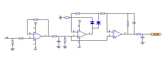 先將電流變換成電壓信號,后跟一個跟隨器使輸出電壓不隨負載的變化而改變,再使用絕對值電路將正負電壓變成DSP的識別電壓(0~3.3V),最后將得到的信號送到DSP。