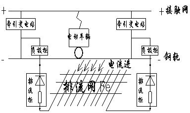 在長期的工程實踐中,人們找到了解決辦法,即在地鐵土建施工時,在軌道道床下設置鋼筋,把每一個供電區間的鋼筋網延軌道縱向焊接成網,在牽引變電所附近引出接線端子。把這張鋼筋網通常叫“排流網”,按圖一所示進行電氣連接,從而為迷流提供了一條低阻值的回流通道。當叢軌道上泄漏的雜散電流電荷在泄漏到地下時,即被這一電氣通道俘獲,因為電流總是走阻值低的路徑回流,所以泄漏到地下的雜散電流必然通過此路徑最終回到整流器負極。從而減小了這部分有害電流向地下泄漏而造成的危害。