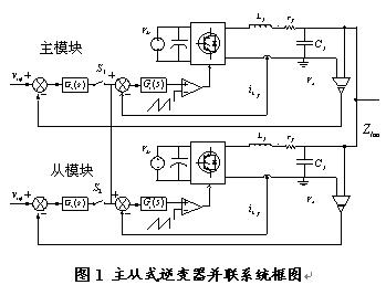 隨著現代通信技術、計算機網絡技術和先進制造技術的發展,計算機和現代通信設備對電源的要求越來越高。并聯技術因其可靠性高、系統擴容方便、易于標準化和模塊化等優點而成為近年來研究的熱點。逆變器的并聯技術主要有集中式控制方案、主從式控制方案、平均電流瞬時值控制方案、有功無功控制方案、下垂特性調節方案等。這些方案各有優缺點。本文從簡單、實用原則出發,采用主從并聯方案實現了兩臺1 k VA 逆變器的并聯。第二節簡單的描述了主從并聯系統的結構;第三節用小信號模型詳細的對單臺逆變器建模,并分析各參數對系統的影響;第四節給出了相關實驗波形和分析;最后做了簡單的總結。