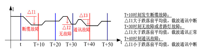 3、 集中控制器根據電壓的有無判斷路燈的工作狀態,在電壓為零(白天)時,根據載波通訊的狀態判斷電纜的狀況,當電壓為220V時,根據回路電流的跌落情況與載波通訊情況,綜合判斷斷纜故障。當載波通訊故障時,判斷兩次載波通訊期間,線路電流是否存在一個超過當前平均值的電流跌落,如果存在,則判斷線路發生斷纜故障,否則判斷載波通訊設備發生故障。