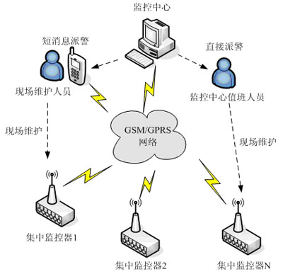 二、防盜系統組網方案 路燈防盜監控系統由監控中心、集中控制器、斷纜監控器三部分組成,其中監控中心至集中監控器采用GPRS連接方式,由于GPRS信號無處不在,可以實時在線,按流量計費,可以成為可靠而廉價通訊鏈路媒介。集中控制器與斷纜監控器之間通過電力載波通訊進行連接,由于電力載波信號是利用既有的電力線作為通訊媒介,所以無須布線,系統實施快速。集中控制器同時采集監控回路的電流電壓信號,用于輔助判斷斷纜警情的發生,防止誤報。電流電壓采集采用獨立模塊,模塊與控制器之間采用RS485進行通訊。