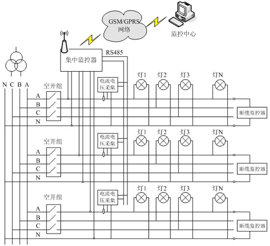 對于路燈線路而言,電纜的盜割已經嚴重影響了城市的形象,危害了交通行駛安全,增加了行人夜路的不安全感,所以如何有效地對路燈線路進行監控,及時發現危害路燈線路安全的盜割行為,及時對盜割行為進行阻嚇及報警,從而減少危害的發生與擴大,是本方案需要解決的問題。