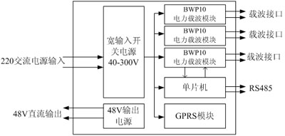 斷纜監控器實時接收集中監控器的詢問數據,并對數據進行回應,斷纜監控器集成了電力載波通訊技術,以及寬電壓輸入的開關電源。在白天時,斷纜監控器的工作電源由集中監控器統一饋送48V直流電源,這樣斷纜監控器就避免采用蓄電池作為后備電源,以此降低系統日后維護成本。