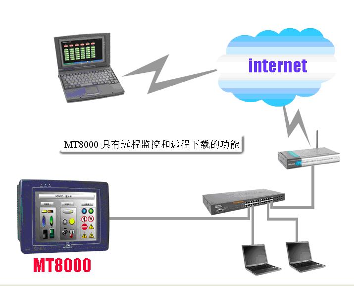 MT8000人機通過以太網,輕松實現了數據的遠程監控以及程序的上傳和下載功能。此功能的實現,省去了技術人員因為小的問題也必須到現場的麻煩。