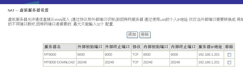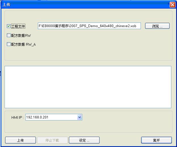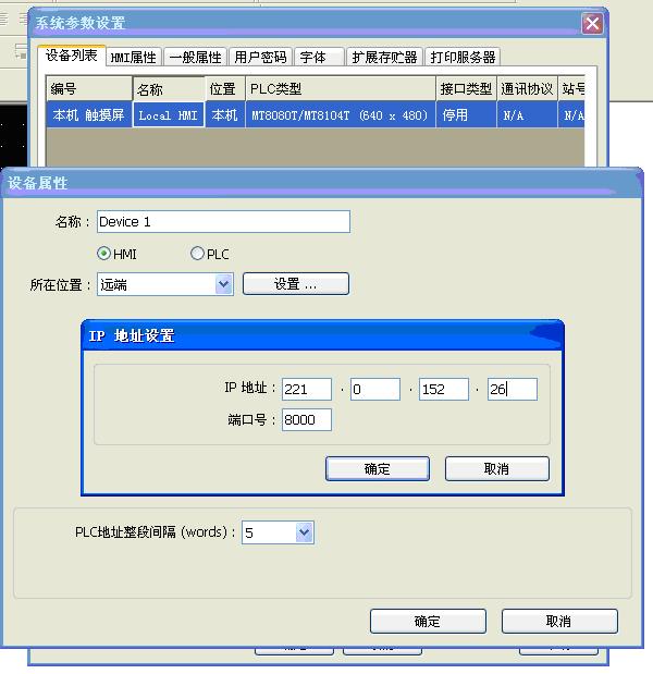 MT8000系列人機帶有以太網接口,通過Ethernet網絡,可以實現對遠程人機或者PLC數據的監控,同時也可以實現對遠程MT8000人機下載程序。 MT8000遠程監控系統的結構圖如下:  其中,MT8000人機上可以連接多種控制器。 實現MT8000的遠程監控功能,首先要對被訪問的MT8000人機所在的局域網的路由器進行設置,方法如下: 1.MT8000的IP設置 觸摸機器的右下角,會在機器底部出現一條工具欄,左面有4個圖標,如圖示  點擊第四個“System Setting”圖標,輸入密碼后(默認密碼111111),出現如下圖所示對話窗口: 在“Netword”一欄中,設定機器的IP地址,完成后保存確定即可。建議設定后重啟一下機器再下載程序。 同時,在EB8000軟件中,設置MT8000的端口號,如下圖所示,可以設為8000.  2.路由器的設置 通過設置路由器,將8000端口號映射到MT8000人機的IP地址上。以TP-LINK路由器為例介紹設置: 在IE地址欄中輸入IP:192.168.1.1,彈出窗口如下圖所示:  輸入路由器對應的用戶名和密碼后,進入路由器的設置界面,將虛擬服務器設置成如下圖所示,即將端口8000映射到MT8000的IP地址,同時將下載的20248端口也映射到MT8000的IP地址。  路由器設置完成后,保存退出就可以了。 同時,也要注意查看一下外網的IP,此時IP為:221.0.152.26。 3.MT8000遠程監控 打開EB8000軟件,新建一個程序,此程序即用來模擬監控遠程人機的數據。系統參數設置如下:  添加完遠程MT8000人機的設備清單如下圖所示:  然后,在EB8000的編輯界面中,設置2個元件: 位狀態切換開關,設置如下圖所示:  注意:PLC名稱處,選擇的是遠端人機對應的名稱。 再放置一個數值輸入元件,如下圖所示:  注意:PLC名稱處同樣要選擇遠端人機對應的名稱。 設置完成后,既可保存編譯程序,執行離線模擬或者在線模擬,當切換LB0的狀態時,遠端MT8000人機上的LB0的狀態會對應的改變;當在電腦上對LW0輸入一個數值時,在遠端的MT8000人機上的LW0地址會顯示電腦上輸入的數值。相反地,也可以在電腦上查看遠端MT8000人機上的數據變化。 至此,即實現了MT8000的遠程監控功能。 4.MT8000遠程下載和上傳 在遠端MT8000人機所在局域網的路由器已經設置好的基礎上,即可開始遠程下載和上傳操作了。 在電腦上打開EB8000軟件,在“Project Manager”窗口上,點擊“下載”按鈕,出現如下圖所示對話框,  [Firmware]一般第一次下載時會選中 [工程文件]要下載到遠端MT8000 人機中的XOB文件所在路徑 [配方數據RW]如果有此配方文件,需要選中 [配方數據RW_A]如果有此配方文件,需要選中 [資料取樣記錄]如果有此資料取樣記錄文件,需要選中 [HMI IP]此處填寫遠端MT8000 人機的IP地址,為:221.0.152.26 [下載完成后自動重啟觸摸屏]如果此項被勾選,程序下載完成后會重啟觸摸屏 [清除配方數據]如果此項被勾選,下載程序前會將機器中的所有配方數據清除為0 [清除事件記錄]如果此項被勾選,下載程序前會將機器中的所有事件記錄文件event log清除 [清除資料取樣記錄]如果此項被勾選,下載程序前會先清除機器上存在的所有Data log文件 設置完成后,點擊“開始下載”,出現提示程序下載進度的對話框,當最后顯示“完成”時,即程序已下載完畢。 也可以在EB8000軟件的編輯界面中,點擊 執行下載,設置窗口如下所示:  無論哪種路徑下載,下載進度的提示信息都是相同的。 如果是遠程上傳,則在EB8000的“Easy Manager”窗口上點擊“上傳”按鈕,出現下圖所示的對話框:  [工程文件]選擇好將上傳的XOB文件保存在電腦的哪個路徑下面 [HMI IP]即遠端MT8000人機所在局域網的外網IP,此處為:221.0.152.26 設置好,點擊“上傳”按鈕,程序開始上傳。