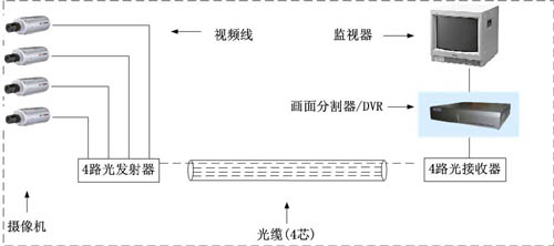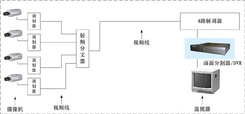 二、射頻傳輸 先把多個(gè)的視頻通過(guò)一個(gè)混合器變成一路射頻信號(hào)輸入,傳輸,在接收端再通過(guò)每一路的調(diào)制解調(diào)器選出自己的頻段。抗干擾通過(guò)調(diào)頻跨過(guò)干擾頻段。射頻傳輸有一個(gè)“射頻傳輸網(wǎng)絡(luò)”,這個(gè)技術(shù)比較復(fù)雜。射頻傳輸工程的成敗的關(guān)鍵點(diǎn)。包括了調(diào)制,混合,多頻道均和等很多技術(shù)。所以需要專業(yè)的人員安裝調(diào)試。1根同軸線可以傳輸多路信號(hào)。遠(yuǎn)距離傳輸也要另外加射頻放大器。 特點(diǎn):也是一根線傳輸,不會(huì)占用很大空間,衰減小;缺點(diǎn)就是調(diào)制比較復(fù)雜。 射頻傳輸接線示意圖如下(4路):
