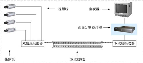四、雙絞線傳輸 雙絞線是100歐的平衡傳輸方式。而目前的攝相機(jī)和后端視頻設(shè)備一般都是75歐阻抗匹配連接。所以用雙絞線傳輸方式要進(jìn)行轉(zhuǎn)換。也就是說(shuō)需要雙絞線傳輸設(shè)備。對(duì)于干擾,雙絞線是開(kāi)放式的,利用雙絞線兩條線纜信號(hào)相等方向相反的特性,抑制外部干擾。傳輸距離0-1500米。一根雙絞線可以傳輸多路信號(hào)。 特點(diǎn):傳輸距離遠(yuǎn),抗干擾能力強(qiáng),布線簡(jiǎn)單。缺點(diǎn)衰減較大需要補(bǔ)償)。 雙絞線傳輸接線示意圖: