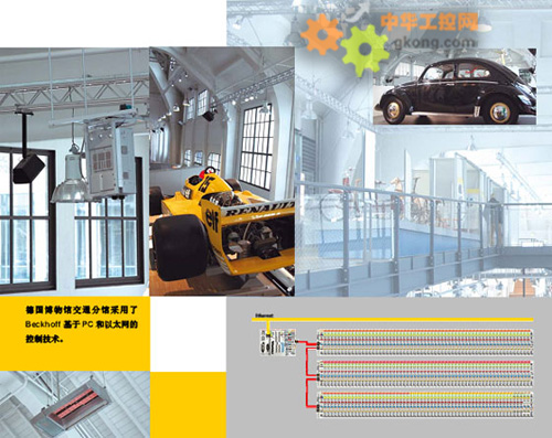德國博物館原慕尼黑展覽中心第三大廳,離“博物館島”有些距離,如今,新第三大廳建筑占地 2200 平米,加上二層走廊面積,可展出面積達到了 3000 平米。德國博物館的交通分館已搬遷至那里,到 2005 年,交通館還將延伸至一號和二號展廳。隨新址落成,整套樓宇自動化系統也煥然一新。系統包含 PC接口、照明、采暖和通風設備的將近 1000 個接點,全部由 Beckhoff 的控制技術來實現。