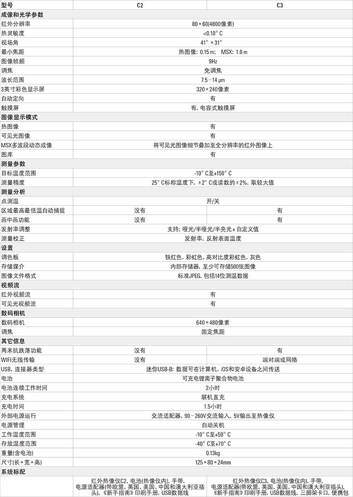 FLIR C2/C3是全球首款功能齊全的口袋式紅外熱像儀,便于隨身攜帶,可隨時發(fā)現(xiàn)各種隱藏問題,以紅外熱圖像的形式清楚顯示能量損耗、結(jié)構(gòu)缺陷和管道問題等。 C2的基本功能包括: MSX?多波段動態(tài)成像、高敏感度、寬視場角,以及全屏測溫圖像等,能夠清晰顯示問題的所在位置,并檢驗缺陷是否修復(fù)完好。 C3的基本性能包括: MSX?實時熱圖像增強(qiáng)、區(qū)域最大或最小溫度測量和Wi-Fi連接,因此能夠 迅速投入使用,發(fā)現(xiàn)隱藏的問題、分享圖像和記錄維修數(shù)據(jù)。