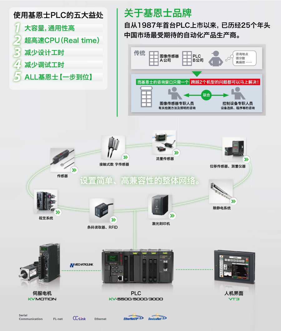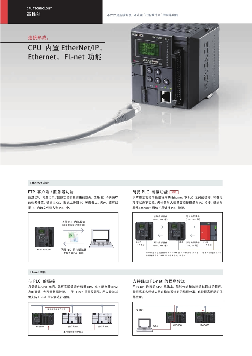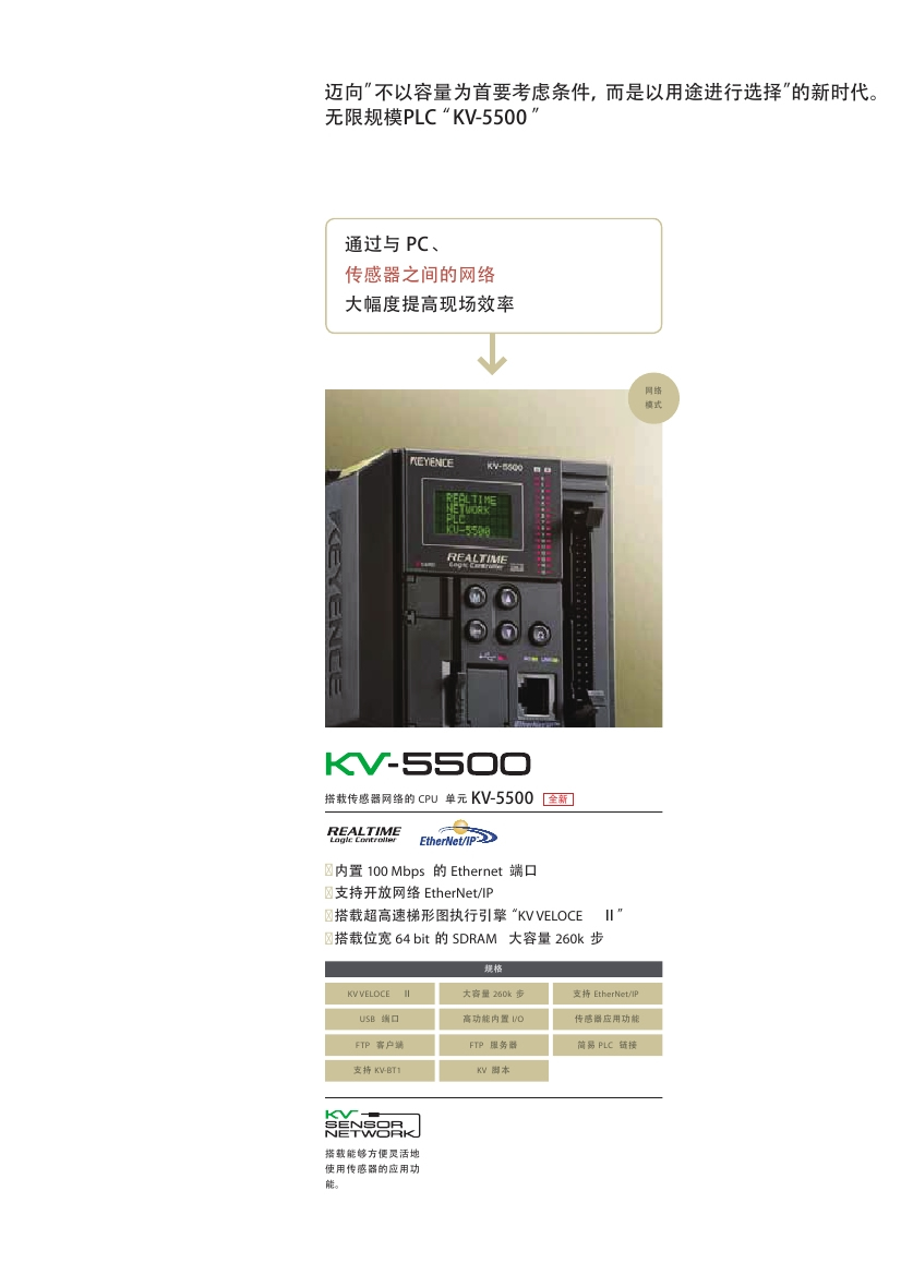 KV-5500通過與PC、傳感器之間的網絡,大幅度提高現場效率。內置100Mbps的Ethernet端口,支持開放網絡EtherNet/IP。