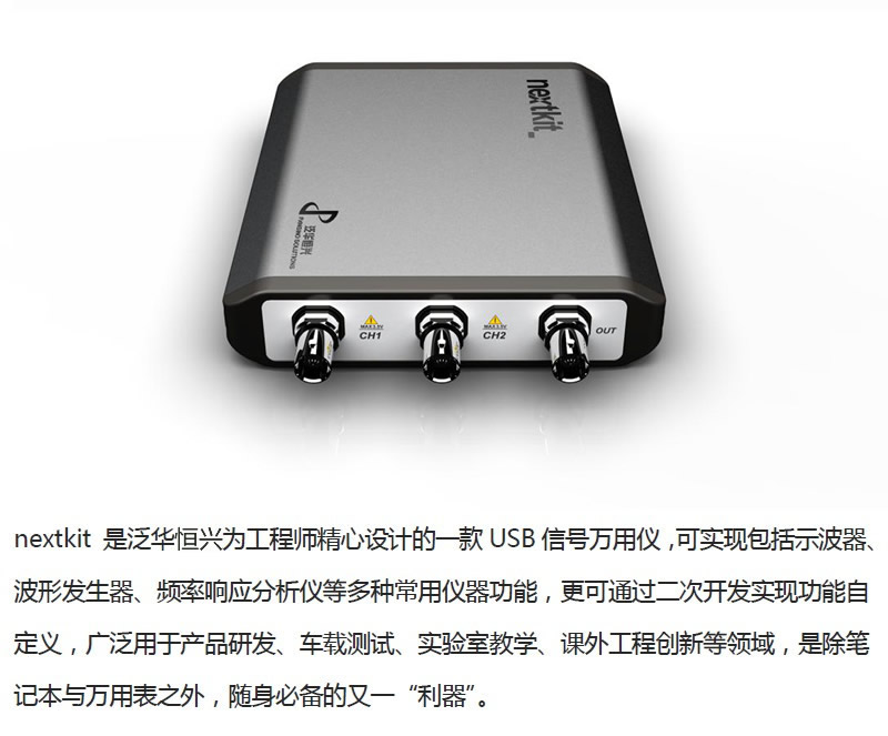 nextkit 是泛華恒興為工程師與工科院校師生精心設計的一款USB信號萬用儀,可實現(xiàn)包括示波器、波形發(fā)生器、頻率響應分析儀等多種常用儀器功能,更可通過二次開發(fā)實現(xiàn)功能自定義,廣泛用于產品研發(fā)、車載測試、實驗室教學、課外工程創(chuàng)新等領域,是除筆記本與萬用表之外,隨身必備的又一"利器"。