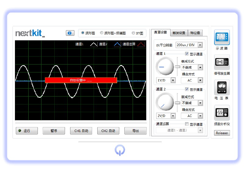 nextkit 是泛華為工程師與工科院校師生精心設計的一款USB信號萬用儀,可實現(xiàn)包括示波器、波形發(fā)生器、頻率響應分析儀等多種常用儀器功能,更可通過二次開發(fā)實現(xiàn)功能自定義,廣泛用于產品研發(fā)、車載測試、實驗室教學、課外工程創(chuàng)新等領域,是除筆記本與萬用表之外,隨身必備的又一"利器"。