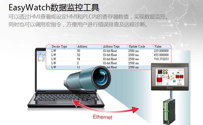 威綸通eMT觸摸屏,不只是一個(gè)顯示的觸摸屏,她更是一個(gè)現(xiàn)場(chǎng)的智能終端,讓自動(dòng)化機(jī)器設(shè)備變得智能、靈活;她可以實(shí)現(xiàn)遠(yuǎn)程監(jiān)控、遠(yuǎn)程數(shù)據(jù)推送&拉取(同步)、遠(yuǎn)程打印、遠(yuǎn)程診斷…它是物聯(lián)網(wǎng)云應(yīng)用的智能節(jié)點(diǎn);實(shí)現(xiàn)以往特殊設(shè)備或PLC才能實(shí)現(xiàn)的功能,可以成為現(xiàn)場(chǎng)生產(chǎn)的監(jiān)控中心,帶來(lái)用戶(hù)生產(chǎn)模式的改變,成為國(guó)內(nèi)OEM廠商提升產(chǎn)品檔次與競(jìng)爭(zhēng)力的有力依托。