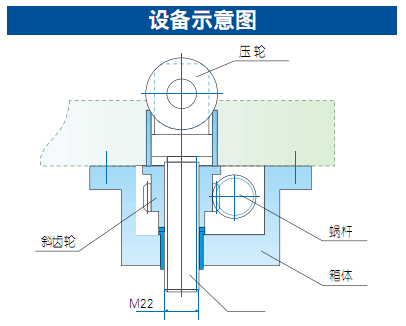 其機構的工作原理是:在蝸桿的一端裝有手輪,轉動手輪帶動蝸桿轉動,再由蝸桿帶動斜齒輪,該斜齒輪在軸向上下兩端被限制住,只能作旋轉運動,且同螺母聯為一體,通過斜齒輪和螺母的旋轉運動,帶動直徑為M22mm的升降桿作上升或下降的直線運動。運動到要求的工藝位置后,升降桿就停止不動了,壓藥動作開始進行,壓藥運行期間,壓輪的最大壓力為1噸,而當壓藥品種需要更換時,再手動調節升降桿上升或向下做直線運動到另一工位。