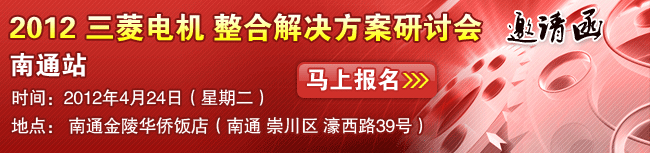 由三菱電機自動化主辦,中華工控網協辦的“三菱電機整合解決方案研討會 (南通)”將于2012年4月24日(星期二)在南通金陵華僑飯店(南通 崇川區 濠西路39號)舉辦。