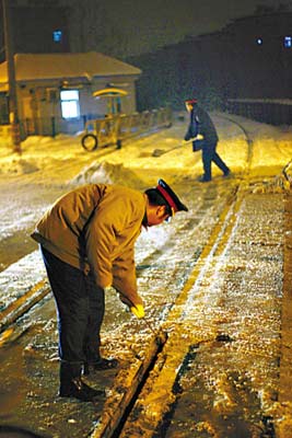 在安徽蚌埠宏業(yè)路大板樓道口,鐵路工人正剔除鐵軌里的冰碴