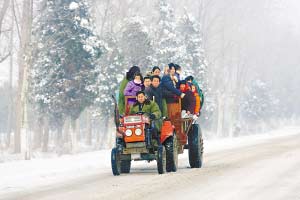 拖拉機(jī)在冰雪路上顫巍巍地行駛著