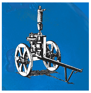 燕肅的指南車是一輛雙輪獨轅車,車上立一木人,伸臂指南。車中,除兩個沿地面滾動的車輪外,尚有大小不同的7個齒輪。由齒數、轉動數,并保證木人指南的目的,可見古人掌握了關于齒輪匹配的力學知識和控制齒輪離合的方法。車輪轉動,帶動附于其上的垂直齒輪,該附輪又使與其嚙合的小平輪轉動,小平輪帶動中心大平輪。指南木人的立軸就裝在大平輪中心。當車轉彎時,車轅會自動控制車上的離合裝置,即竹繩、滑輪和鐵墜子,就可以控制大平輪的轉動,從而使木人指向不變。